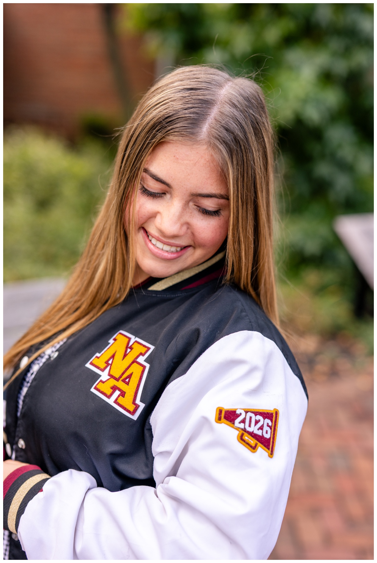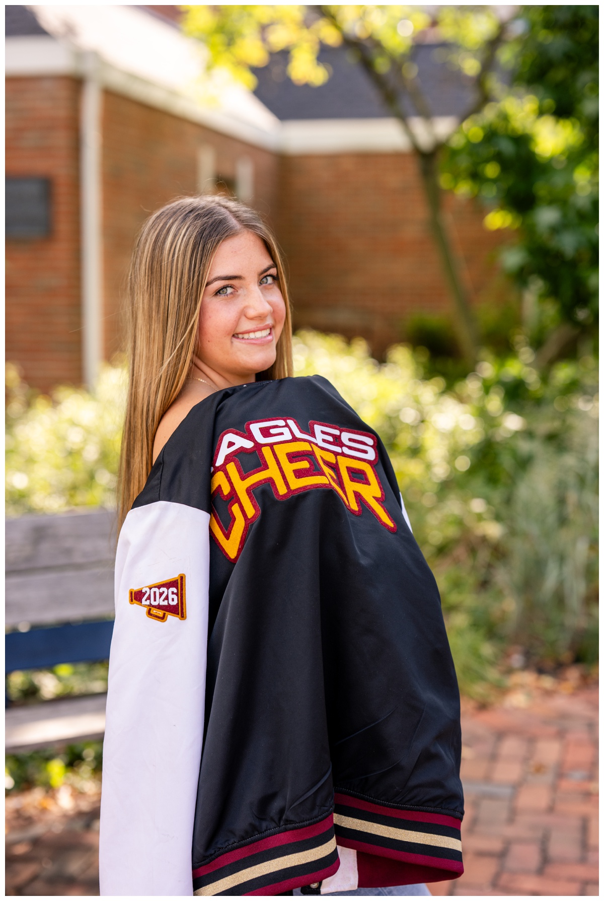 One of my favorite details from her session was incorporating her competition team jacket. Cheer has been such a big part of her high school years, and I love when seniors bring pieces of their story into their session. We snapped a few photos featuring her jacket, and you could just see the pride and memories stitched into it. Those images feel timeless, a snapshot of all the hard work, practices, competitions, and friendships that shaped this chapter of her life.
